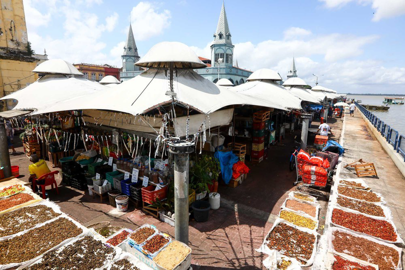 În restaurantele locale, açaí-ul zdrobit, sub formă de sos gros violet, este servit alături de numeroase preparate tradiționale, în special cu pirarucu, un pește de apă dulce din Amazonia la fel de apreciat cât este de gustos, care poate ajunge până la trei metri lungime.