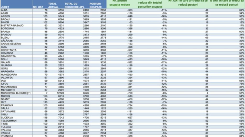 Detaliile privind distribuția tăierilor pe județe arată că cele mai multe posturi vor fi reduse în Prahova (724 de posturi în 68 de UAT-uri), București (708 posturi), Argeș (649 posturi în 58 de UAT-uri), Suceava (627 posturi în 48 de UAT-uri), Galați (522 posturi în 61 de UAT-uri), Mureș (513 posturi în 56 de UAT-uri), Hunedoara (450 posturi în 46 de UAT-uri) și Iași (439 posturi în 65 de UAT-uri).