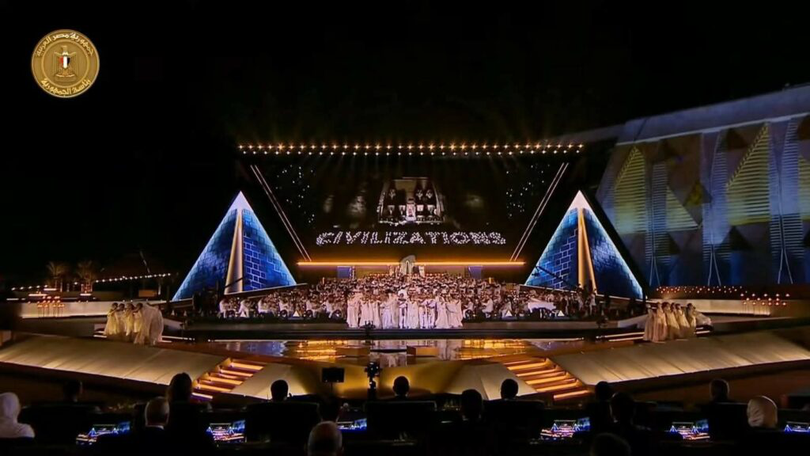 Cairo a avut un rol semnificativ în medierea acordului din luna trecută pentru încheierea războiului Israel-Hamas. Ca atare, bannerele și iluminările de la ceremonia de sâmbătă au transmis mesajul Egiptului ca „țara păcii”.