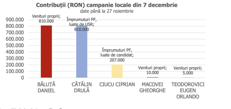 Până la 27 noiembrie, la doar șase zile de la startul campaniei, doar Daniel Băluță și Cătălin Drulă au atins plafonul maxim de 810.000 de lei – Băluță din fonduri proprii, Drulă prin finanțare de la partid, care a contractat împrumuturi de la persoane fizice.