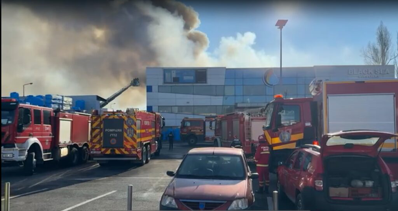 ȘTIRE INIȚIALĂ: Potrivit autorităților, incendiul se manifestă în interiorul spațiului de depozitare, pe o suprafață de aproximativ 800 de metri pătrați. Ard materiale sanitare, mase plastice și alte materiale combustibile.