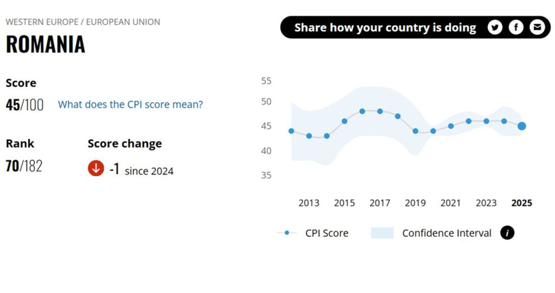 Raportul arată că scorurile cuprinse între 43 și 47 de puncte sunt considerate un „interval de încredere”, ceea ce indică faptul că fluctuațiile minore nu sunt neapărat semnificative din punct de vedere statistic. Cu toate acestea, tendința descendentă confirmă stagnarea eforturilor anticorupție din România.