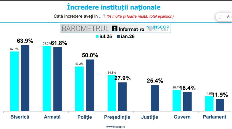 Urmează Armata, cu un capital de încredere de 61,8% (față de 63% în iulie 2025) și Poliția cu 50% (față de 43,2% în iulie 2025).