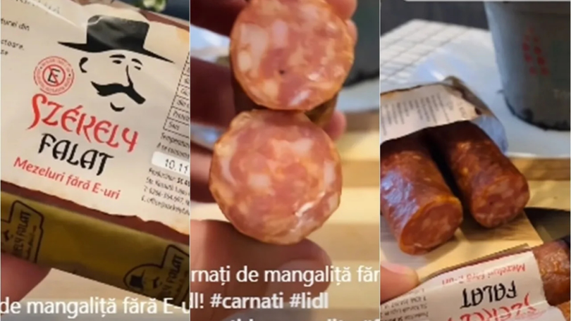 „Am luat cârnaţi de mangaliţa fără E-uri la Lidl la 20 de lei. Sunt de la firma Szekely Falat. Se vede şi din ingrediente că nu au conservant nitritul de sodiu. Au sare, boia dulce, piper negru, usturoi, ienibahar. În interior arata foarte bine, pare un cârnat tradiţional, iar la gust este foarte bun”, spune internautul care a prezentat cârnaţii fără E-uri din Lidl.