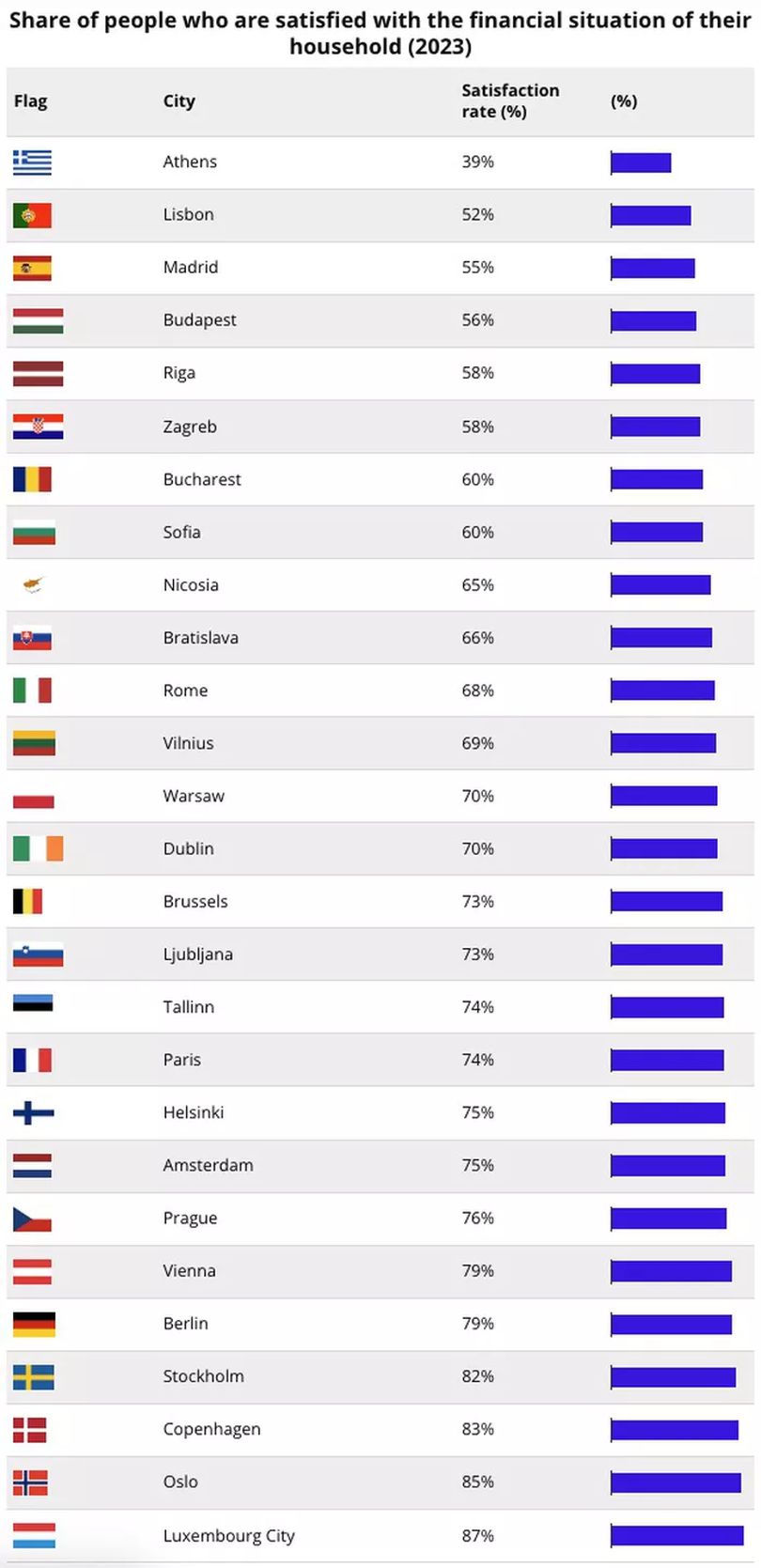România e mult în spatele țărilor din UE la acest capitol. Numai 60% dintre bucureșteni sunt mulțumiți de situația lor financiară din momentul de față, arată un sondaj făcut de Comisia Europeană în 2023. În alte țări, cum ar fi Copenhaga sau Luxemburg, 83%, respectiv 87% din locuitori sunt mulțumiți de veniturile lor.