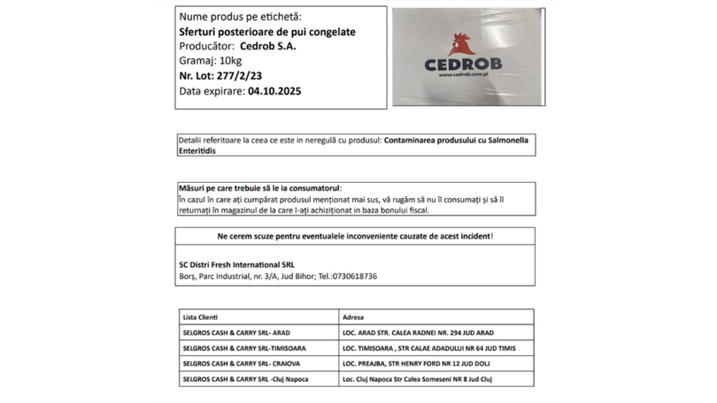 Autoritatea Națională Sanitară Veterinară și pentru Siguranța Alimentelor (ANSVSA) a emis o alertă de sănătate publică în urma descoperirii unui lot de carne de pui contaminată cu Salmonella Enteritidis. Producătorul Cedrob S.A., în parteneriat cu Selgros, a retras de la comercializare sferturi posterioare de pui congelate suspecte, pentru a preveni orice risc asupra consumatorilor, potrivit realitatea.net.