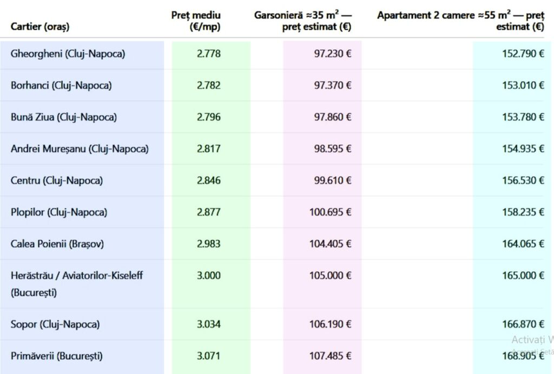 - Cartierul Borhaci, Cluj-Napoca – preț mediu per metrul pătrat de 2.782 de euro. O garsonieră poate costa 97.370 de euro. Un apartament de 2 camere poate avea un preț de 153.010 euro.