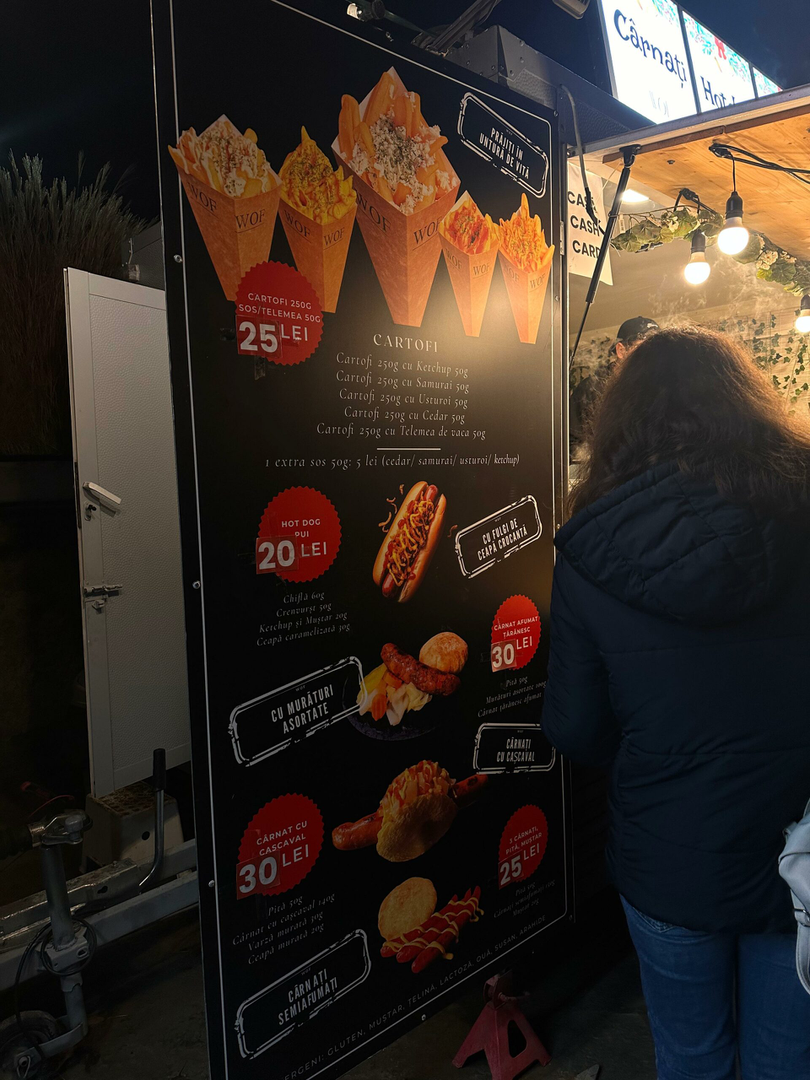 O simplă porție de cartofi (250 de grame) cu sos la alegere costă 25 de lei, un hot-dog e 20 de lei, un cârnat cu cașcaval sau cârnat afumat țărănesc cu murături – 30 de lei. Cârnații semiafumați sunt 25 de lei.