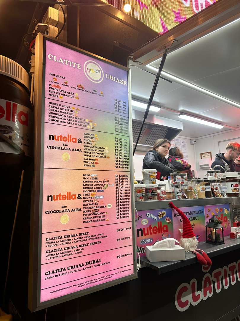 Clătitele sunt cele mai scumpe. Cele simple (cu Nutella, ciocolată albă, unt de arahide, miere) costă 25 de lei, iar cele care conțin și alte ingrediente sau fructe ajung la 30, respectiv 35 de lei. Cele mai scumpe sunt clătitele uriașe (40 de lei) și clătita uriașă Dubai (45 de lei).