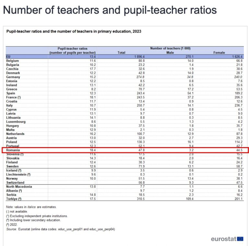 Potrivit datelor oficiului de statistică al Uniunii Europene, România înregistrează 18,4 elevi per profesor, ceea ce depășește cu mult media Uniunii Europene, de 13,4 elevi per profesor.