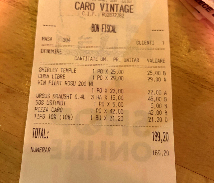 „Cum ai bacșiș de 10% în valoare de 21,2 lei, iar tot bonul este de 189 de lei? / ”190 de lei? Nu mai face lumea paranghelie acasă? De banii ăia rupeam ficatul pe genunchi… Sau ok, bun înțeleg, dar măcar în scară sau în pădure… Nu mai e de mers în localuri de prin vara lui 2022”/ Tipsul ăla nu pare 10%. Sunt tare curios cum l-au calculat” / Niciodată când sunteți la Cluj să nu mai mergeți la Caro”