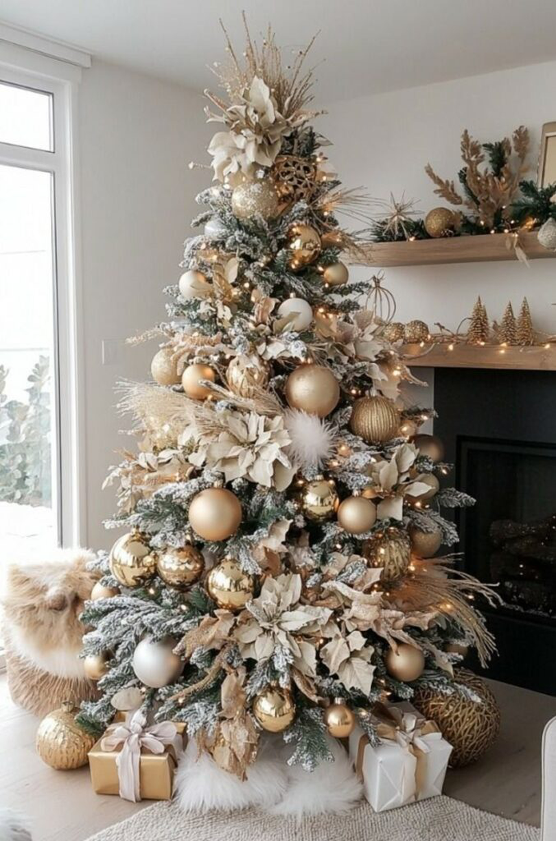 Pentru un brad care inspiră un vibe elegant și de lux optează pentru combinația de culori alb & auriu. Alege ornamente simple, precum panglici din bumbac, figurine ceramice sau decorațiuni din hârtie. Adaugă luminițe calde pentru o atmosferă liniștitoare.