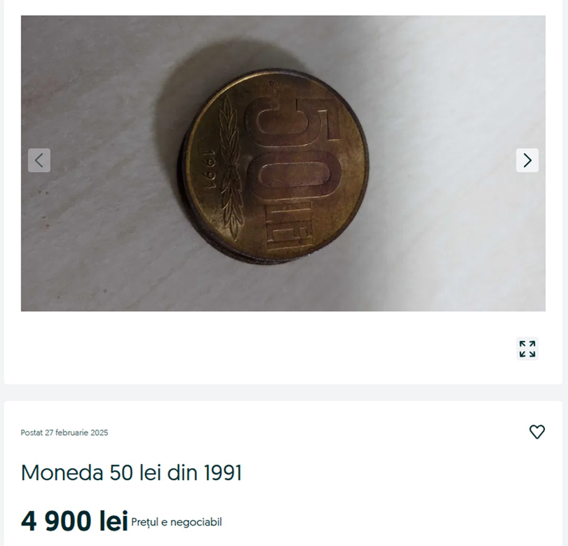 Anunțul a fost postat pe OLX de un utilizator care susține că vinde mai multe monede de 50 de lei din anii 1991, 1992, 1993, 1994, 1995 și 1996. Prețul de pornire este de 4.900 de lei, însă vânzătorul menționează că acesta este negociabil.