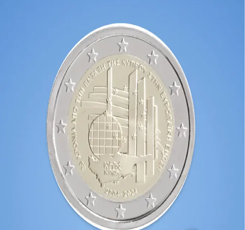 Pe aceeași față apare inscripția în limba greacă: „20 ΧΡΟΝΙΑ ΑΠΟ ΤΗΝ ΕΝΤΑΞΗ ΤΗΣ ΚΥΠΡΟΥ ΣΤΗΝ ΕΥΡΩΠΑΪΚΗ ΕΝΩΣΗ” („20 de ani de la aderarea Ciprului la Uniunea Europeană”), alături de anii 2004–2024, scrie Mediafax.
