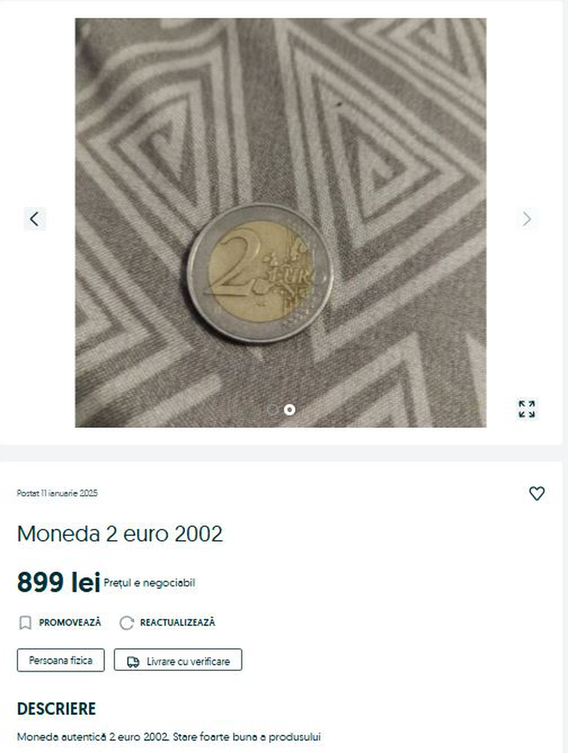 Un român vinde pe o platformă de specialitate moneda de 2 euro lansată în 2022, după introducerea monedei unice europene, cu 899 de lei. A fost emisă la Munich, Germania, și are harta Europei pe față, iar pe spate vulturul german.