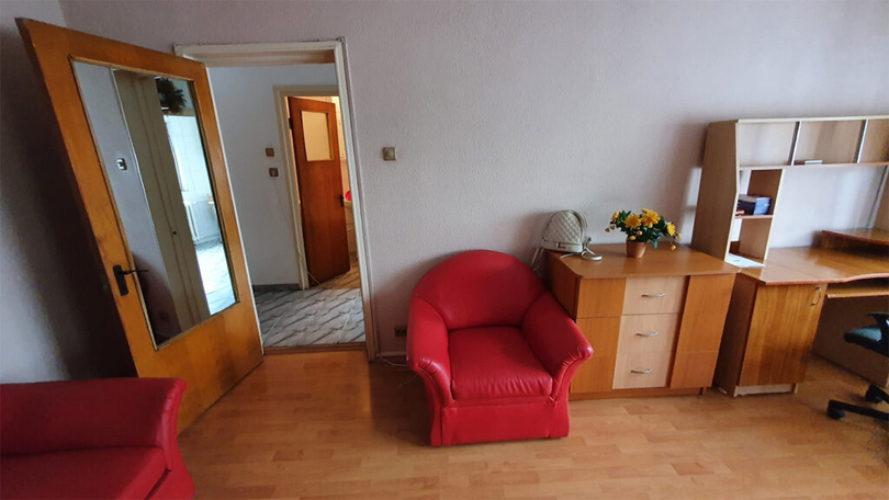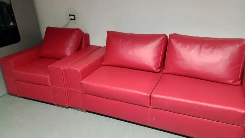 În fotografie apare o canapea, dar și un fotoliu roșu, care ar face parte din același set.