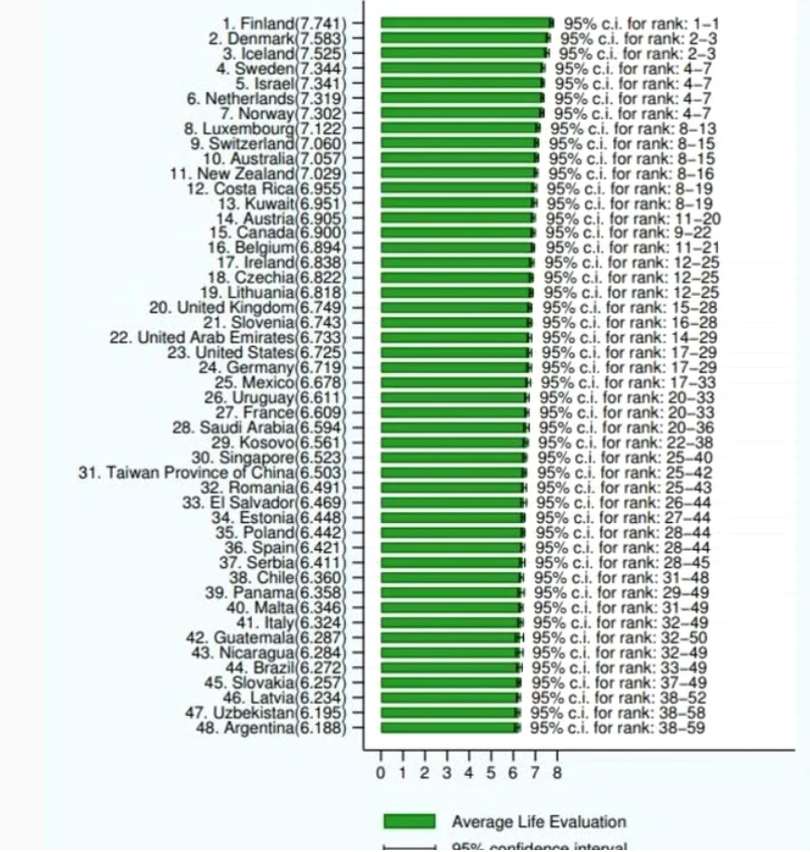 Raportul Mondial al Fericirii. Țările nordice sunt toate relativ bogate și fericite, dar nu toate națiunile relativ bogate sunt fericite ca nordicii. Singapore, a treia cea mai bogată țară din lume, se află pe locul 26, în timp ce Arabia Saudită, una dintre cele mai bogate din lume, se află pe locul 27.