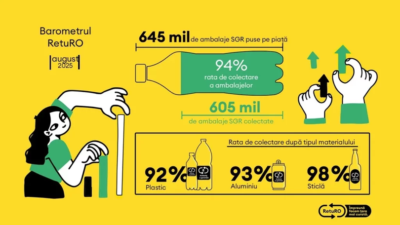 Numai în august 2025 au fost colectate 605 milioane de ambalaje, ce reprezintă aproape 94% din cantitatea ce este pusă pe piață.