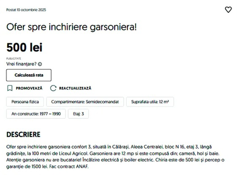România are cea mai ieftină Chirie în Călărași. Garsoniera are o suprafață de 12 metri pătrați și este compusă din cameră, hol și baie. Nu are bucătărie, iar încălzirea este electrică, cu boiler electric. Proprietarul cere 500 de lei pe lună și percepe o garanție de 1.500 de lei, cu contract la ANAF.