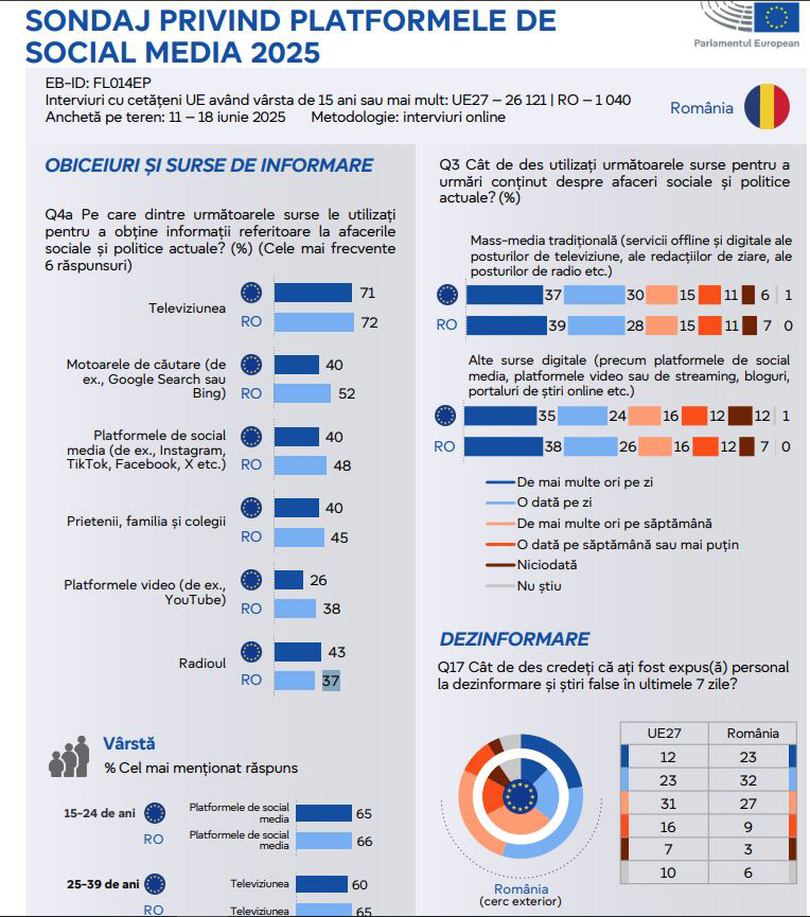 Cei mai mulți dintre români își iau informațiile de la posturile de televiziune și peste jumătate dintr-un eșantion de peste 1000 de persoane se informează de pe motoarele de căutare, cum ar fi Google sau Bing și aproape jumătate de pe social media. Aproape 40% dintre ei se informează ascultând radioul. Peste 20% dintre respondenți au spus că s-au simțit expuși la dezinformare în ultimele șapte zile, arată un sondaj al Parlamentului European privind platformele de social media.