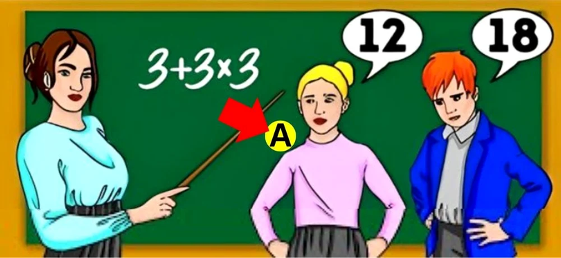 Ia o pauză și privește cu atenție ecuația! Un profesor a scris pe tablă „3 + 3 x 3”, iar doi elevi, A și B, au dat răspunsuri diferite. Elevul A spune că rezultatul este 12, în timp ce elevul B afirmă că este 18. Care dintre ei are dreptate? Îți dai seama în 5, 4, 3, 2, 1… START!