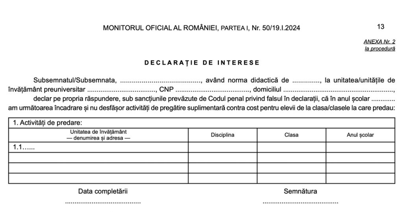 Declarația include și norma didactică a dascălului, disciplina și clasa la care predă și anul școlar în curs. Documentul trebuie să fie datat și semnat.
