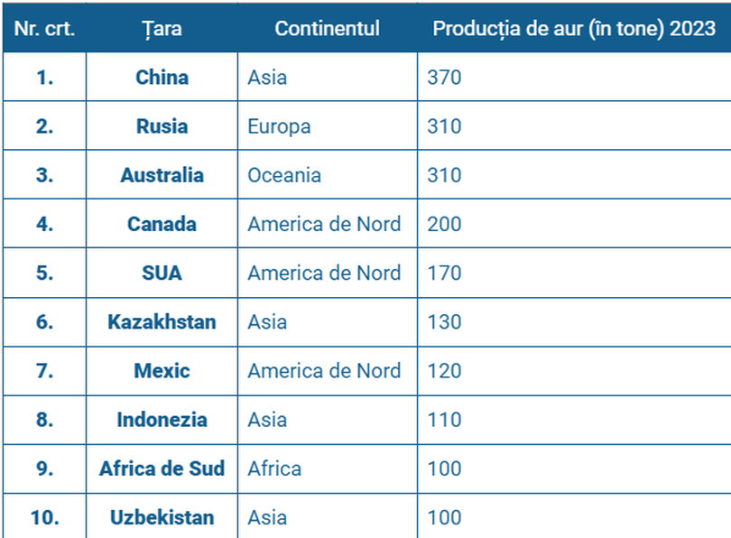 Exploatarea aurului este o afacere globală, cu operațiuni pe toate continentele, cu excepția Antarcticii. China, Australia, Rusia și Canada erau cei mai mari producători de aur din lume în 2023, conform Statista, când producția mondială de aur a atins aproximativ 3.000 de tone. La nivel de țară, China a fost cel mai mare producător din lume în 2023 și a reprezentat aproximativ 12% din producția mondială totală.
