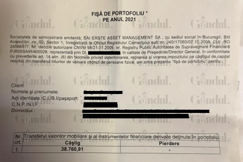 În urmă cu câțiva ani, femeia a cumpărat acțiuni la un fond de investiții – SAI ERSTE ASSET MANAGEMENT SA, depozitarul fondurilor de investiții fiind Banca Comercială Română. În 2021, valoarea dividendelor a fost în valoare de 38.760,91 lei, iar femeia a retras întreaga sumă, arată Gândul.