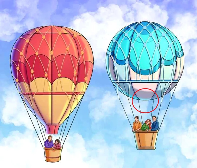 În fața noastră este un desen simplu, care prezintă două baloane cu aer cald aflate deja în aer, cu pasageri la bord. Cele două baloane au culori diferite și forme ușor distincte. Mulți s-ar grăbi să caute greșeli evidente, cum ar fi diferențe de culoare, erori minore în fundal sau ceva în neregulă cu pasagerii. Dar la prima vedere, totul pare normal și nimic nu iese din comun.