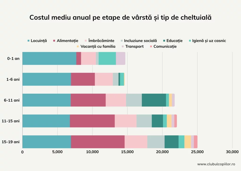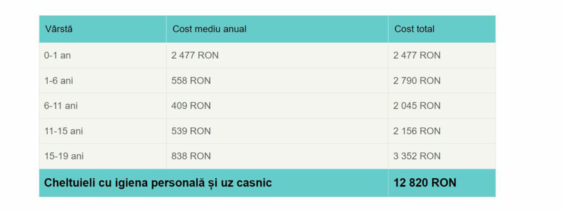 Clubulcopiilor.ro a efectuat un studiu axat pe evaluarea costului minim necesar pentru creșterea unui copil de la naștere până la vârsta de 19 ani (până la terminarea liceului) în cadrul unei familii din mediul urban.