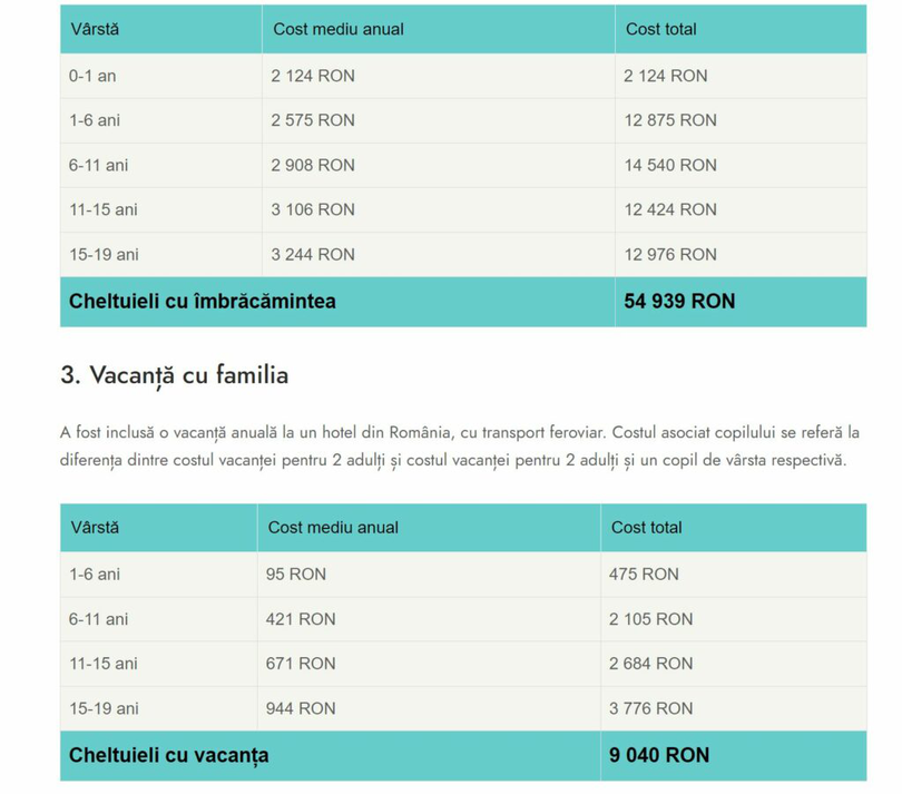Costul total pentru creșterea unui copil născut în 2024 ajustat la rata inflației este estimat la 594 070 RON pentru primul copil și 417 989 RON pentru cel de-al doilea copil. Astfel părinții care își doresc 2 copii vor avea un cost de cel puțin 1 mil RON pentru creșterea acestora până la terminarea liceului.