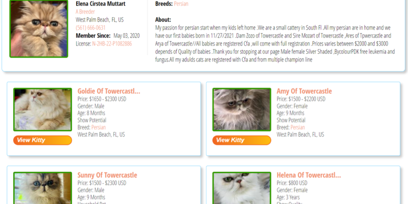 ”Pasiunea mea pentru pisicile persane a început când copiii mei au plecat de acasă. Suntem o mică crescătorie din sudul Floridei. Toate pisicile noastre persane trăiesc în casă, iar primii noștri pui s-au născut pe 27 noiembrie 2021. Mama este Zozo de la Towercastle și tatăl este Mozart de la Towercastle, iar Ares de la Towercastle și Arya de la Towercastle. Toți puii sunt înregistrați la CFA și vor veni cu înregistrare completă. Prețurile variază între 2000 și 3000 de dolari, în funcție de calitatea puilor. Vă mulțumim că ați vizitat pagina noastră. Avem masculi și femele Silver Shaded, Bi-colour, PDK. Toate pisicile mele adulte sunt înregistrate la CFA și provin din linii de campioni multipli”, a povestit aceasta pe un site specializat în vânzarea pisicilor de rasă. Puii de pisică sunt puși la vânzare cu prețuri cuprinse între 500 și 3.000 de dolari.