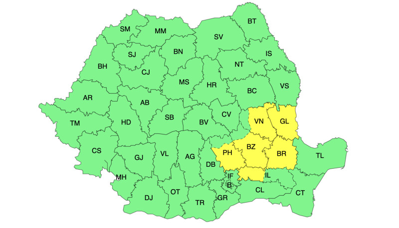 Un alt cod galben, valabil luni între orele 6:00 și 18:00, vizează intensificări ale vântului în județele Galați, Brăila, vestul județului Ialomița și în zonele joase ale județelor Vrancea, Buzău și Prahova, unde vântul va sufla temporar cu rafale de 50…70 km/h.