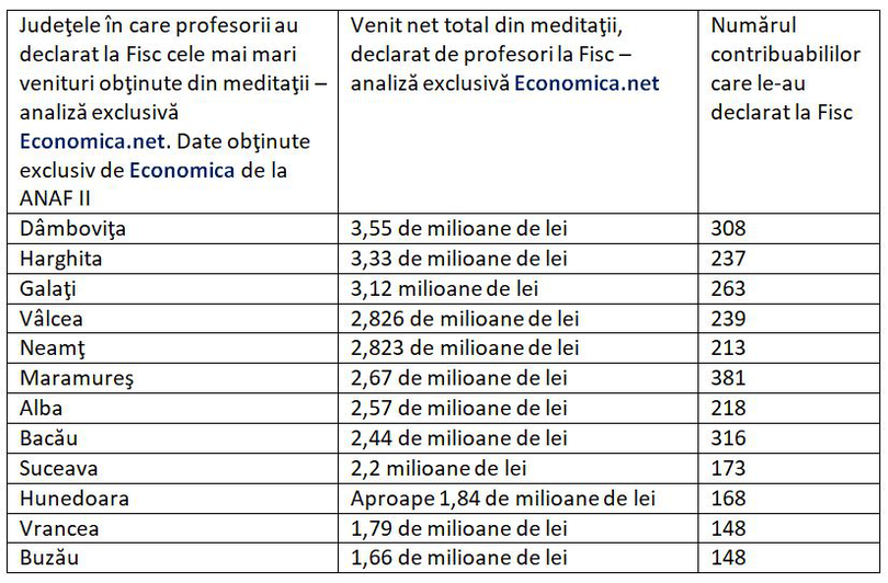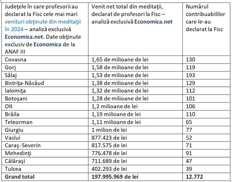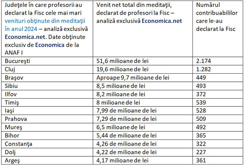 Iată sumele nete pe care profesorii, conform declarațiilor depuse la ANAF, le-au obţinut din meditaţii în 2024 şi numărul acestora, defalcate pe judeţe, potrivit informaţiilor de la Fisc.