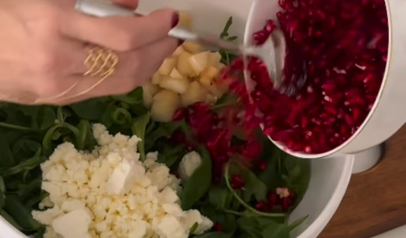 “Salata are un sos foarte gustos, din muștar, sare, ulei de măsline, oțet de mere, miere și brânză feta, rodie, ca să o facă foarte colorată și e un antioxidant foarte bun, pere, cred că o să pun una singură, să nu iasă foarte, foarte dulce și ceapă pentru sos… și mai am nucile pecan care sunt super, super sănătoase, te ajută să îți reduci colesterolul, reglează zahărul din sânge și ajută la digestie (…) și în primul rând, îți produc o senzație de sațietate, ca să nu mănânci atât de mult cum suntem noi obișnuiți”, a spus vedeta.