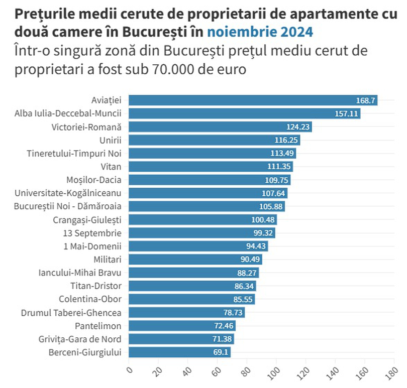 În clasamentul celor mai scumpe apartamente cu două camere, în funcție de cartier, primul este Aviației, cu o medie de circa 169.000 de euro. Urmează Alba Iulia-Decebal-Muncii, cu o medie de 157.000 de euro, Victoriei-Romană (124.000 de euro) și Unirii, cu 116.000 de euro pentru un apartament cu două camere.
