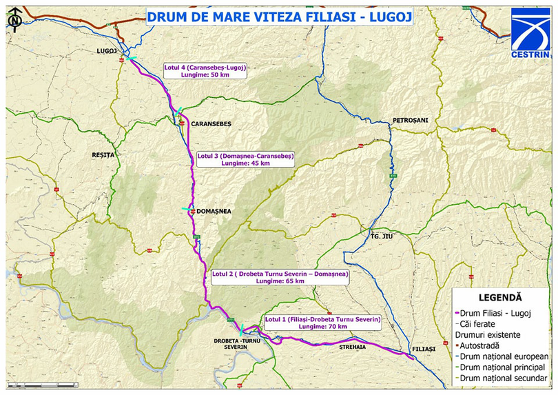 Drumul de mare viteză Filiași-Lugoj (aproximativ 230 km) este împărțit în patru loturi: