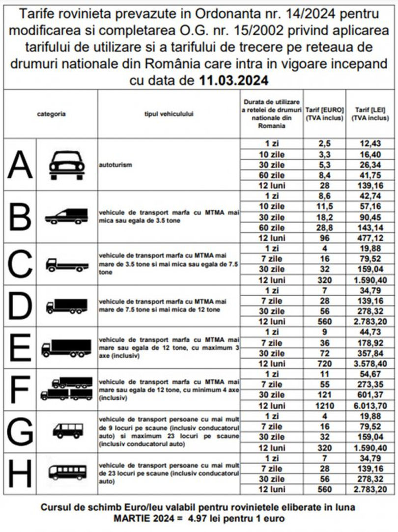 Totodată, tarifele pentru rovinietele cu o valabilitate de 7 și 90 de zile pentru autoturisme au fost eliminate. Aceste ajustări se aplică și pentru vehiculele de transport marfă cu o greutate mai mică de 3.500 de kilograme.