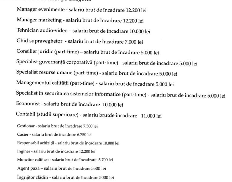 Salariile angajaților variază între 5.000 de lei brut pe lună pentru un om de serviciu și 12.200 de lei pentru managerul de evenimente.