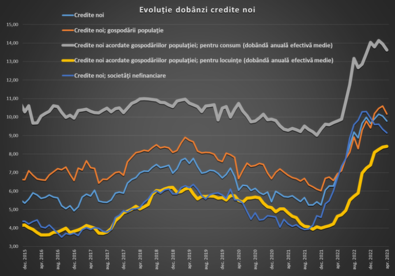 Rata medie de dobândă pentru creditele noi în lei acordate societăților nefinanciare a scăzut cu 0,2 puncte procentuale la 9,14%. Dobânda la împrumuturile în lei pentru firme s-a redus cu 1,15 puncte procentuale față de vârful atins în noiembrie, pe fondul relaxării condițiilor de lichiditate.