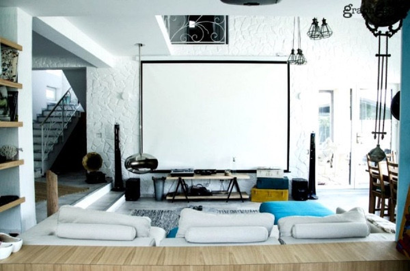 Predomină nuanțele de albastru și bej, iar decorul este completat de covoare rustice pline de culoare. Ferestrele sunt mari și cu deschidere către curtea interioară.