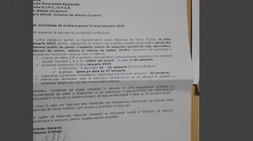 Achitarea drepturilor se vor face la domiciliu în perioada de 10-22 ianuarie 2025, la ghișeu până pe 27 ianuarie.