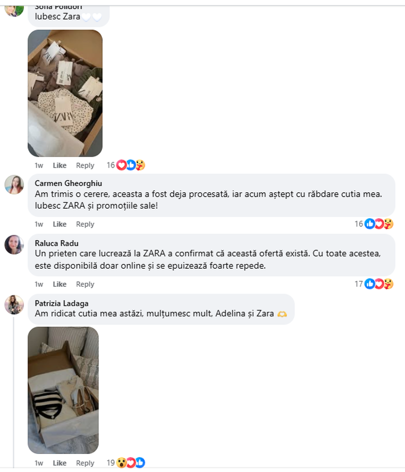 Primul instinct când vezi o postare de acest fel este să mergi în secțiunea de comentarii și să vezi ce spun și alte persoane despre „oferta de neratat” sau dacă există persoane care au încercat să intre în posesia „cutiei misterioase”. Astfel, cei care au nevoie să se convingă că nu este o înșelătorie observă mesaje de la conturi false de genul: „Am trimis o cerere, aceasta a fost deja procesată, iar acum aștept cu nerăbdare cutia mea. Iubesc ZARA și promoțiile sale!”.