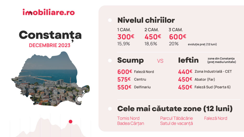 “Am asistat la un an cu evoluții record pe segmentul chiriilor, cu creșteri anuale de până la 20% în Constanța și de până la 14,3% în București. În mod atipic, creșteri mari au fost înregistrate pe segmentul apartamentelor cu 3 camere, pentru care în mod tradițional cererea este mai scăzută, ceea ce arată un interes al familiilor (cu copii) pentru închirieri, mult mai accentuat decât în anii anteriori. Oferta continuă să fie scăzută, iar nivelul actual al dobânzilor va contribui și în lunile următoare la amânarea planurilor de achiziție a unei părți importante din cumpărători. Ne așteptăm să vedem în continuare creșteri pe segmentul chiriilor”, a declarat Daniel Crainic, director de marketing Imobiliare.ro.