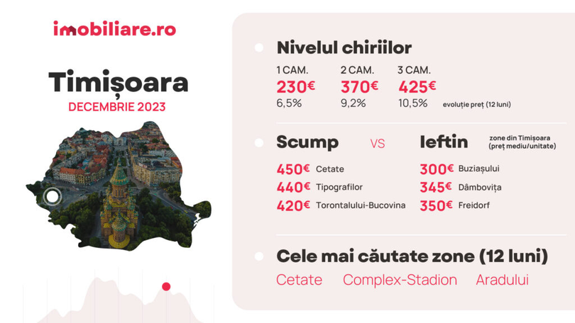 Cea mai scumpă zonă din oraș, Cetate, este și una dintre cele mai căutate, alături de Complex – Stadion și Aradului. Chiria medie ajunge la 450 euro/lună. O altă zonă unde chiriașii plătesc chirii sensibil mai ridicate este Tipografilor. În acest caz, media se situează în jurul valorii de 440 euro/lună. La polul opus se află cartiere precum Buziașului, Dâmbovița sau Freidorf, unde un chiriaș achită lunar pentru un apartament între 300 și 350 euro.