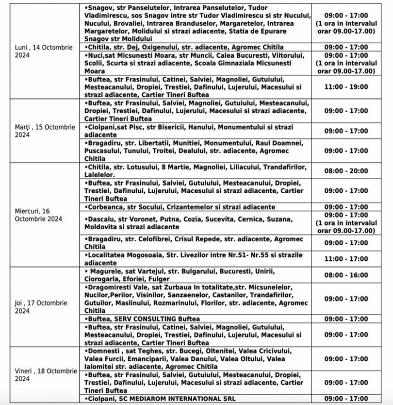 Lista străzilor din Ilfov unde vor fi întreruperi de curent în perioada 14-18 octombrie 2024: