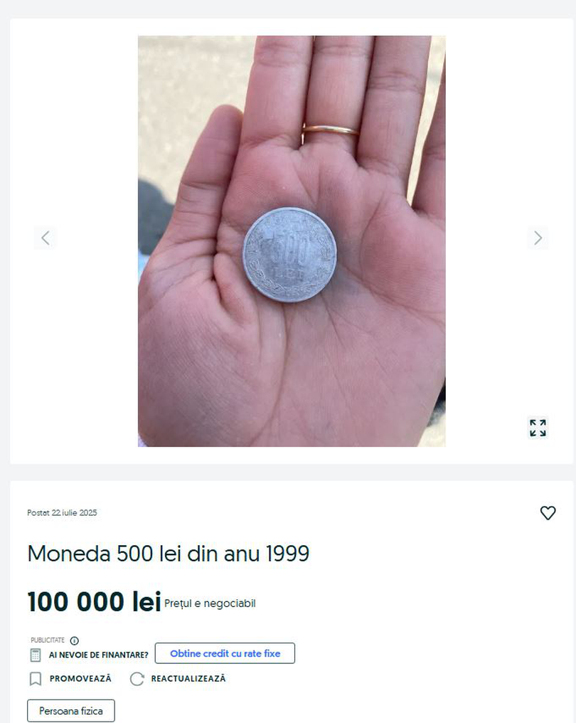 Pentru această monedă, vânzătorul cere prețul de 100.000 de lei, suma fiind negociabilă. În postare, utilizatorul a notat „Vând monedă de 500 lei din anul 1999. În stare foarte bună. Negociabil”.