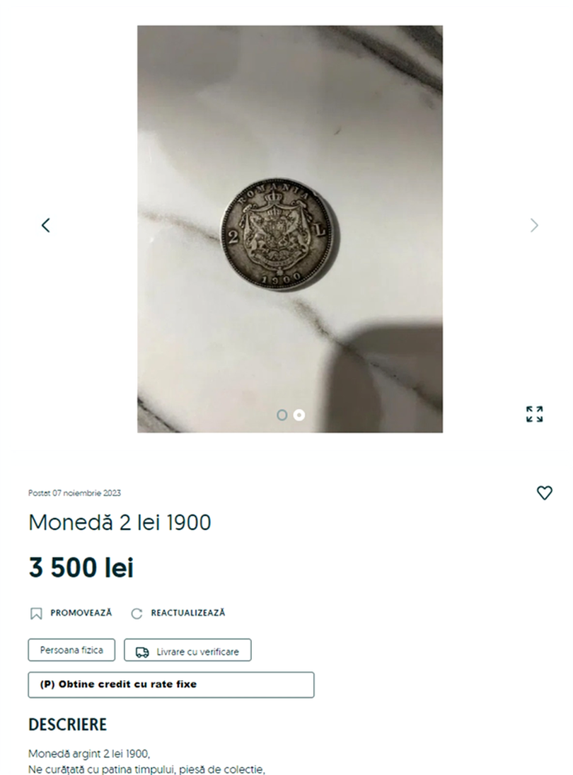 De exemplu, moneda de doi lei din 1900, prezentată pe OLX, este descrisă ca o „piesă de colecție cu patina timpului”. Aceasta servește drept exemplu al diversității și valorii pieselor din patrimoniul numismatic românesc.