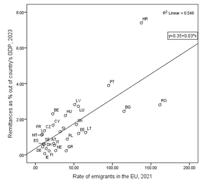 2023 a fost un an de vârf, în materie de bani trimiși acasă de către românii emigranți. De ce? Aș relua tema și întrebarea în perspectivă comparativă. Cred că se pot obține detalii prin compararea remitențelor economice transmise acasă de migranții români din străinătate, dacă vom plasa fenomenul în perspectivă mai largă. Întrebarea de la care pornim este dacă fenomenul în discuție este specific românesc, în contextul Uniunii Europene? Datele financiare pe care le folosim sunt, majoritar, cele ale Băncii Mondiale[1], iar cele despre populație provin din estimări ale EUROSTAT.