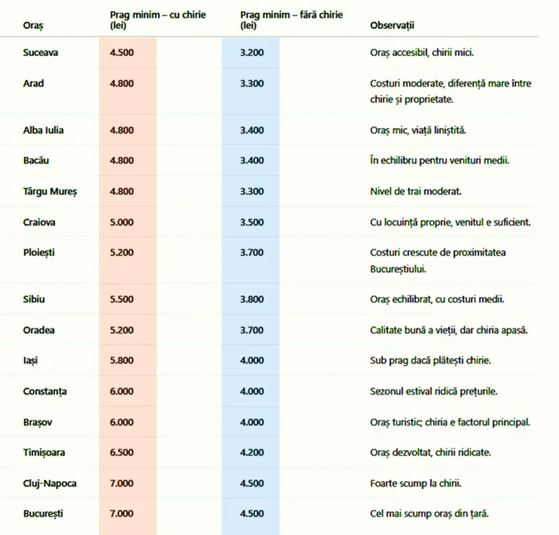 Tabelul se încheie cu orașele Iași, Constanța, Brașov, Timișoara, Cluj-Napoca, București, unde sumele cresc considerabil. Capitala este considerată cel mai scump oraș din țară, unde trebuie să ai un venit de 7000/4.500 de lei.